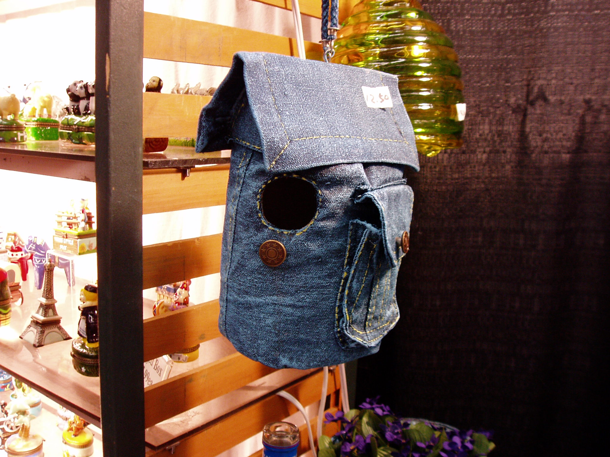There was even more whimsy, like this birdhouse fashioned from blue jeans. Would a bird really live here? Or would the faeries featured in the moss purses move in?