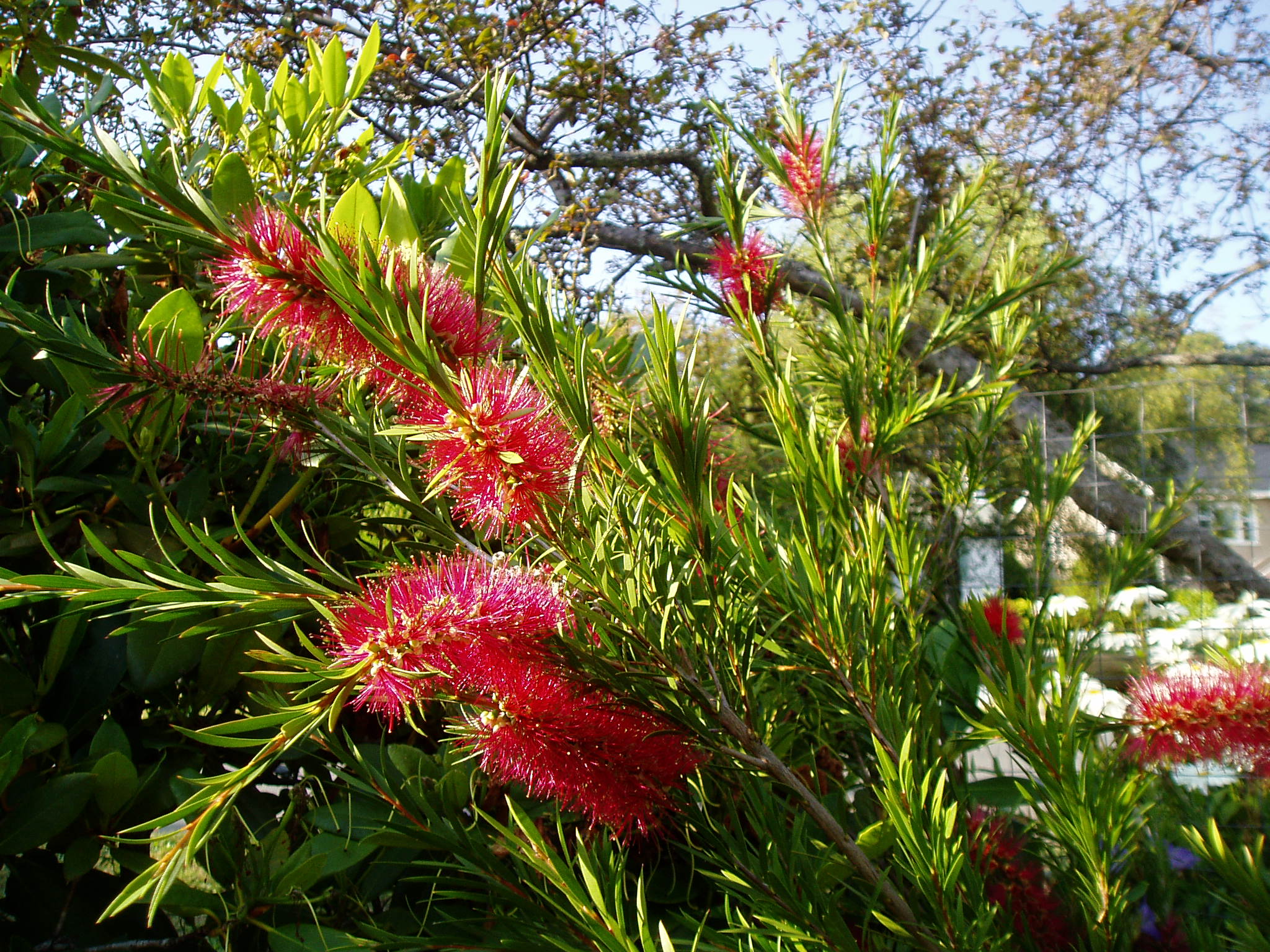Instead of bobbing at the top of stem-like normal flowers do, the bottlebrush flower petals circle the branch itself. These blossoms remind me of the gizmo we use to wash out wine bottles. The name bottlebrush is àpropos.
