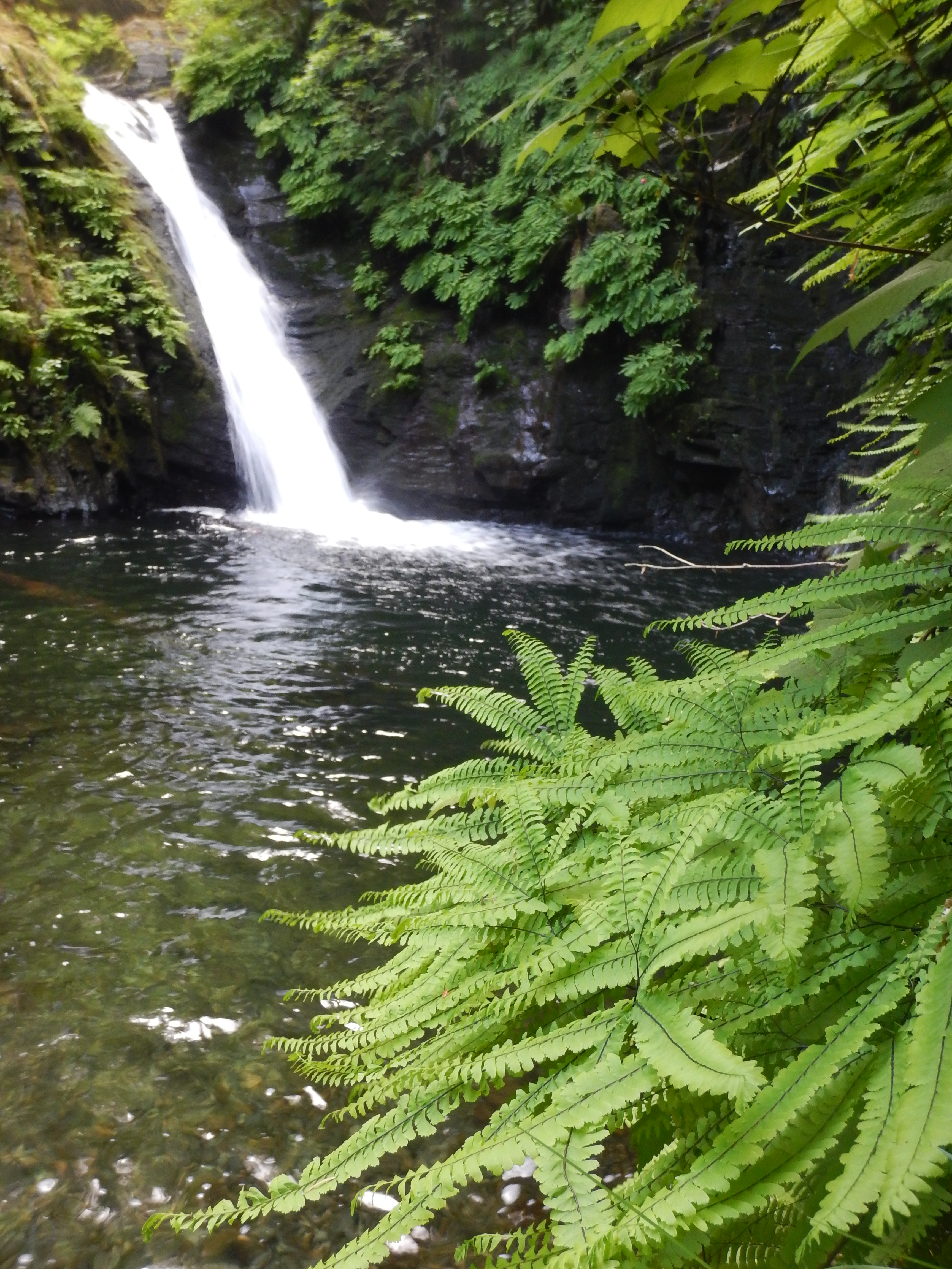 A colony of maidenhair fern (Adiantumpedatum ) grows not far from the fringecup. They also like the moist forest setting – but they like it really moist. They’re practically bathing in the mist of the waterfall. ‘Adiantum’ is Latin for ‘unwetted’. The foliage sheds rain.