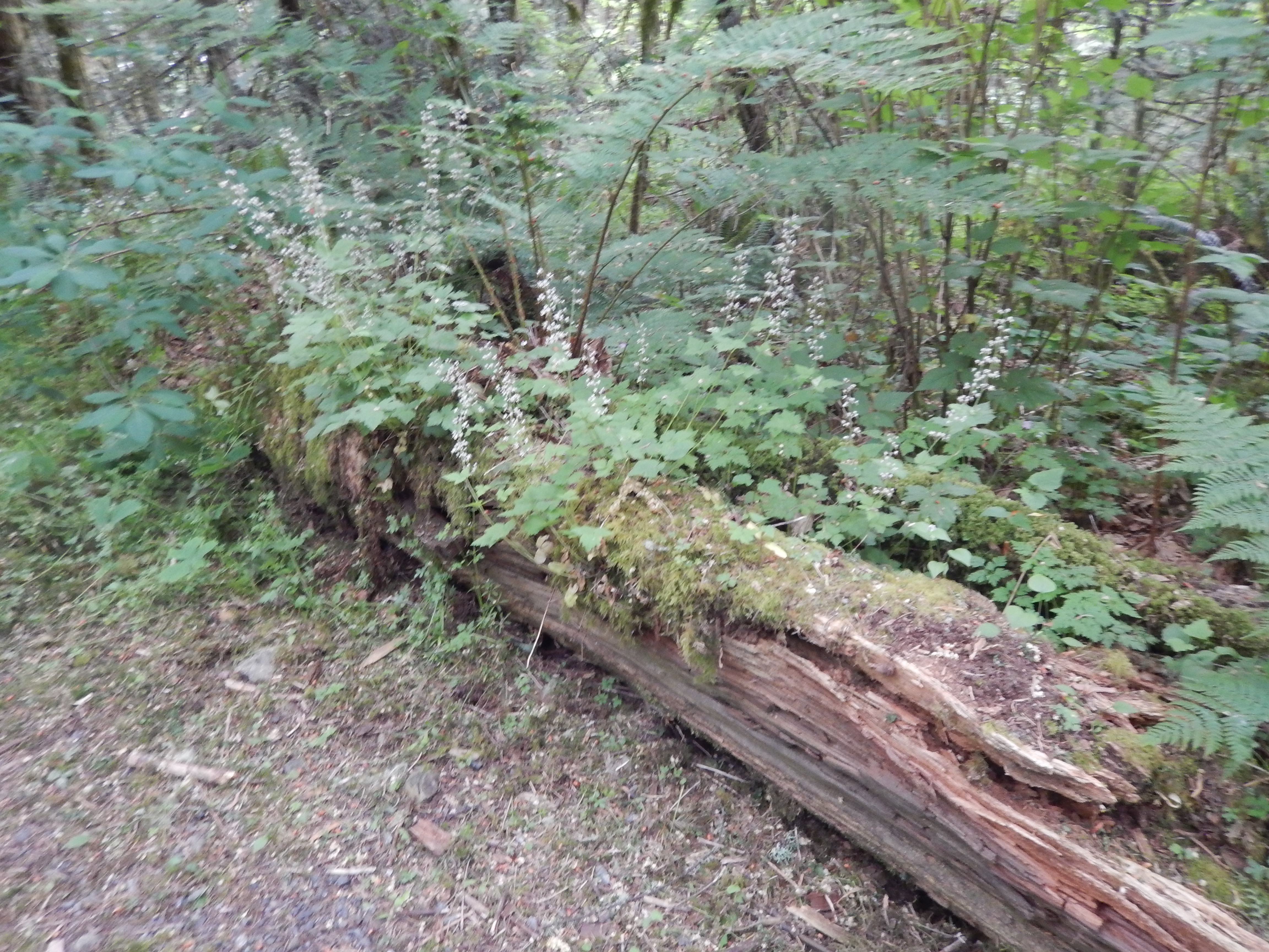 The foamflower (Tiarella trifoliata) is right at home on an old, rotting log not far from the stream-bank.