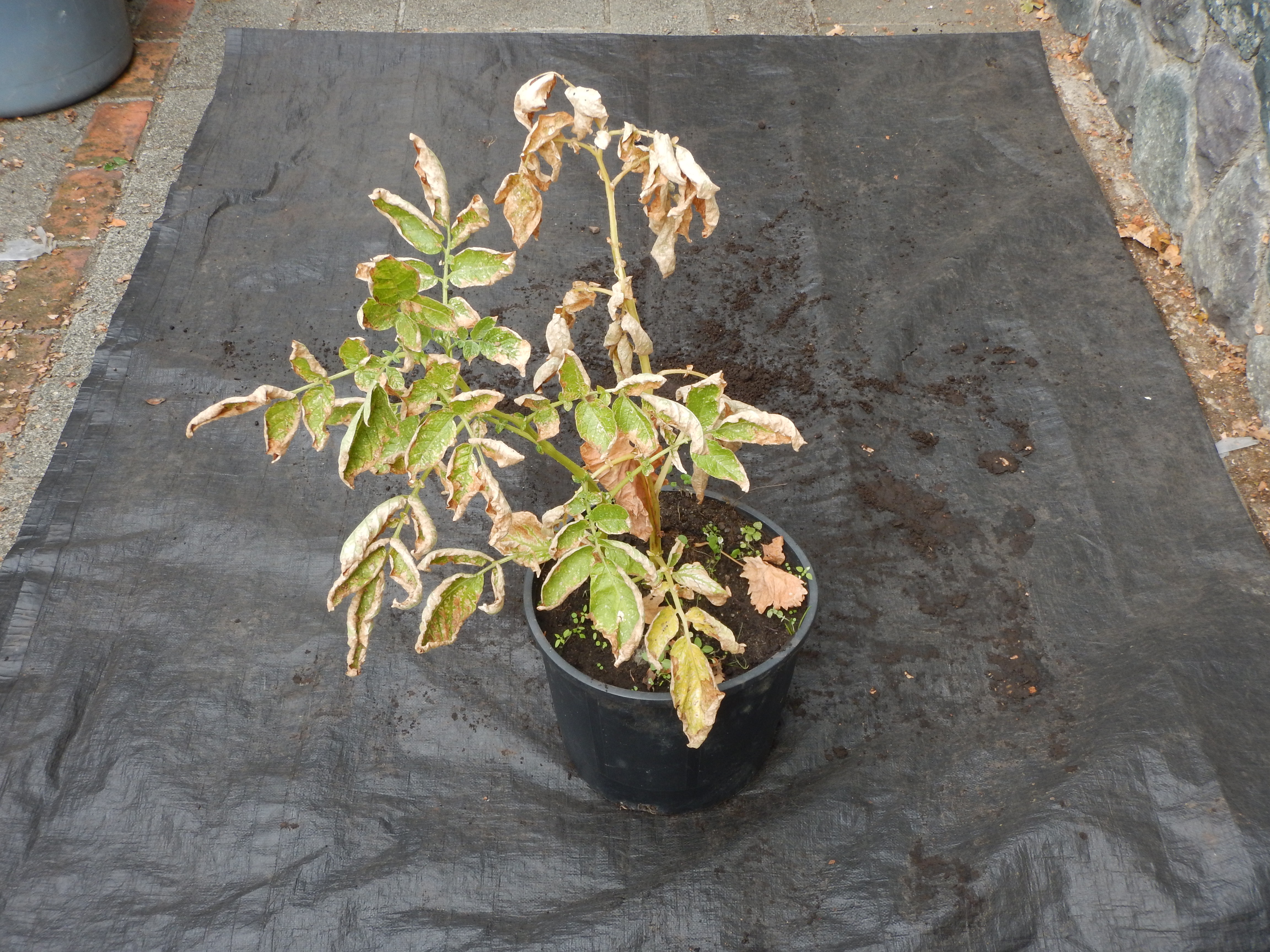 Growing potatoes above ground only works well IF the soil is protected from heat.    Our courtyard is super-hot.  So now the pressure’s off – – next year I can try potatoes in the rich compost at the top of our mountain, and as long as I can keep them watered… and safe from the deer…
