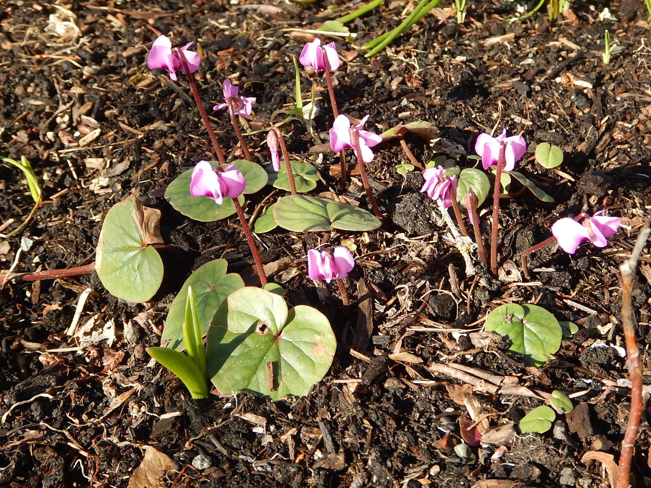 The Cyclamen coum unfurl their petals as the sun warms them. More blooms are on their way, too! Soon they’ll be a mound of pink.