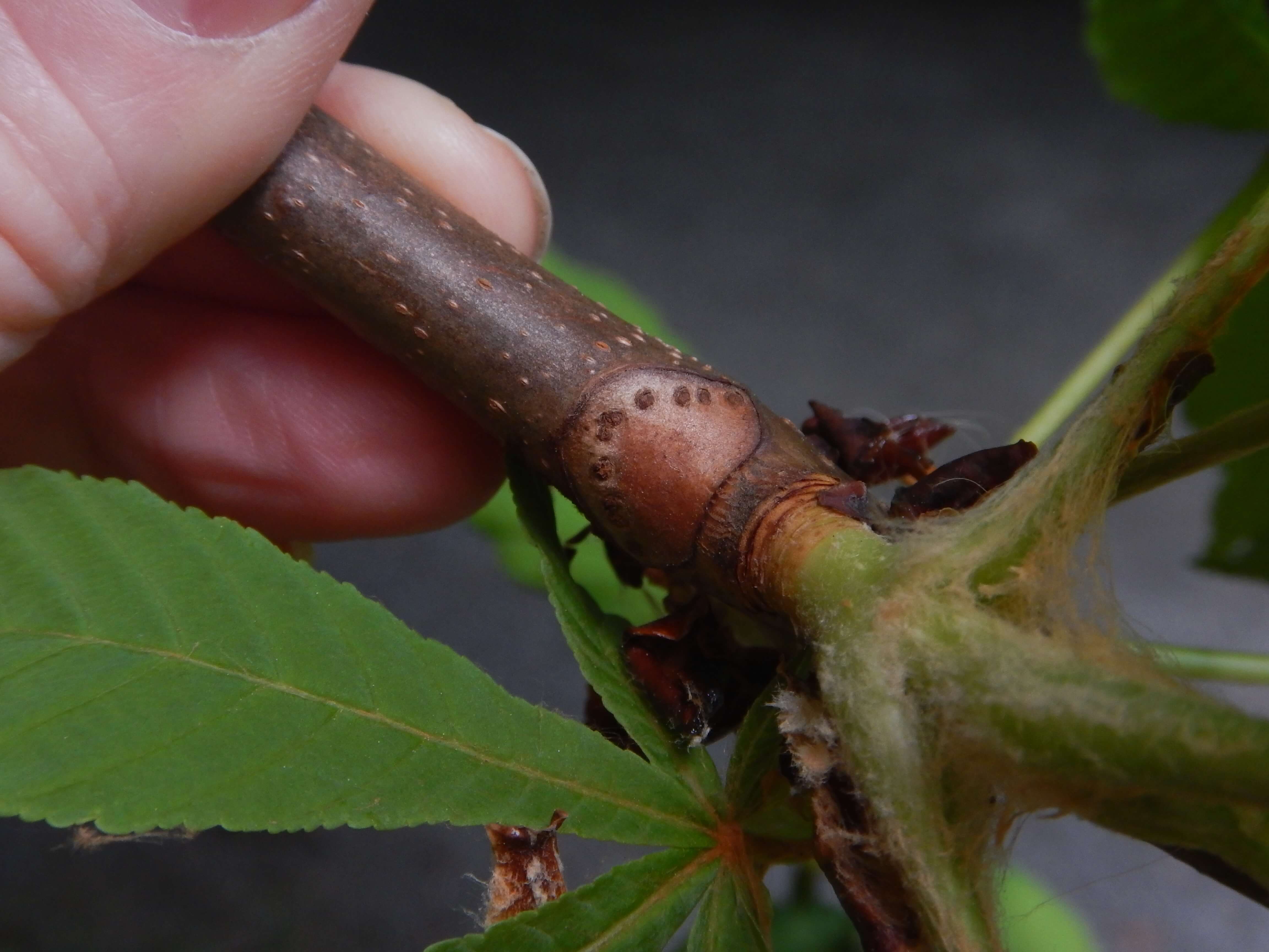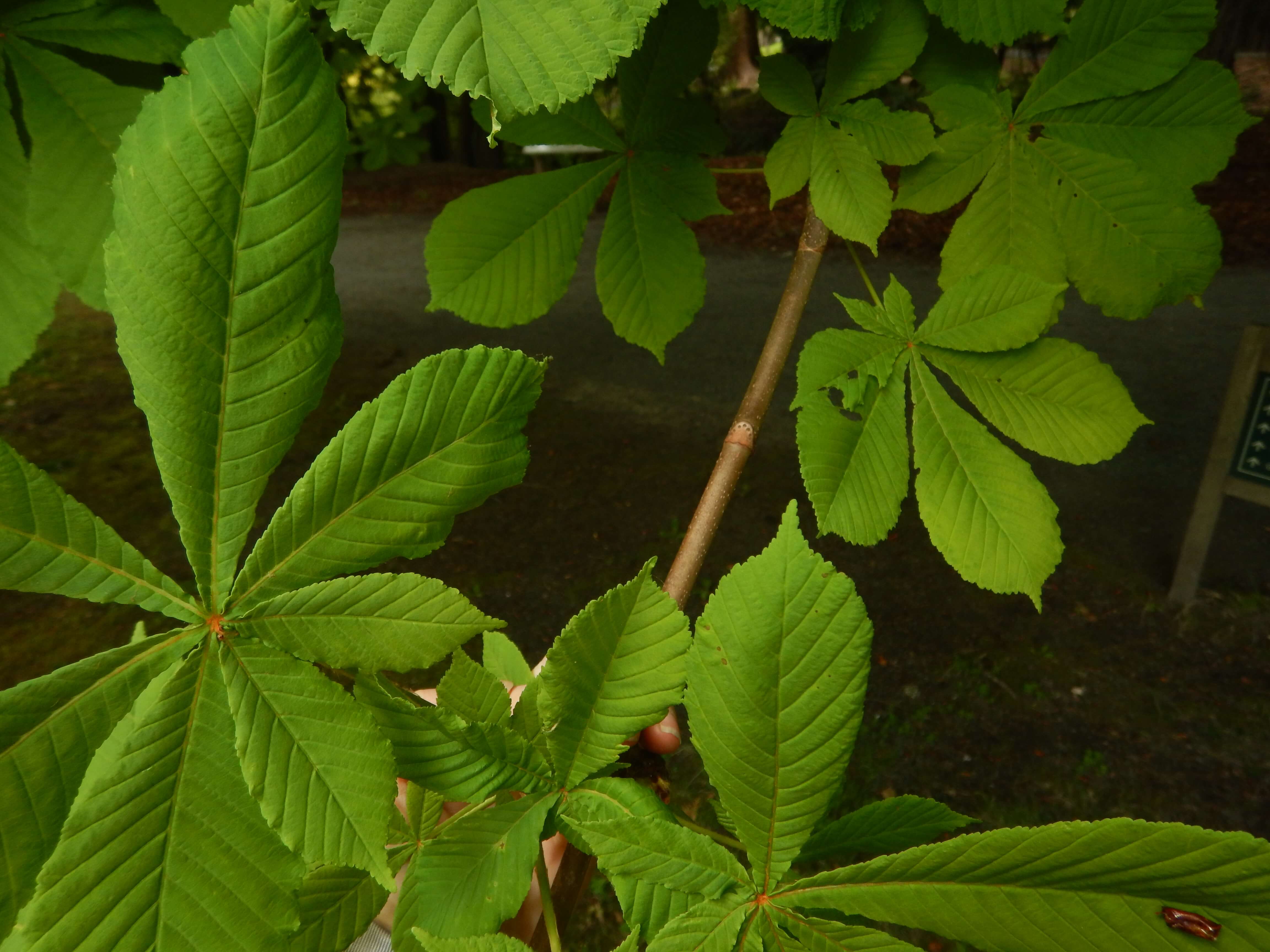 It’s recently come to my attention that there’s a simple way to ID the Horse-chestnut at any time of year: Look closely at the branches. Along the branch, just beside where the leaf joins the twig, is a little U-shaped mark of a horseshoe — nails & all.