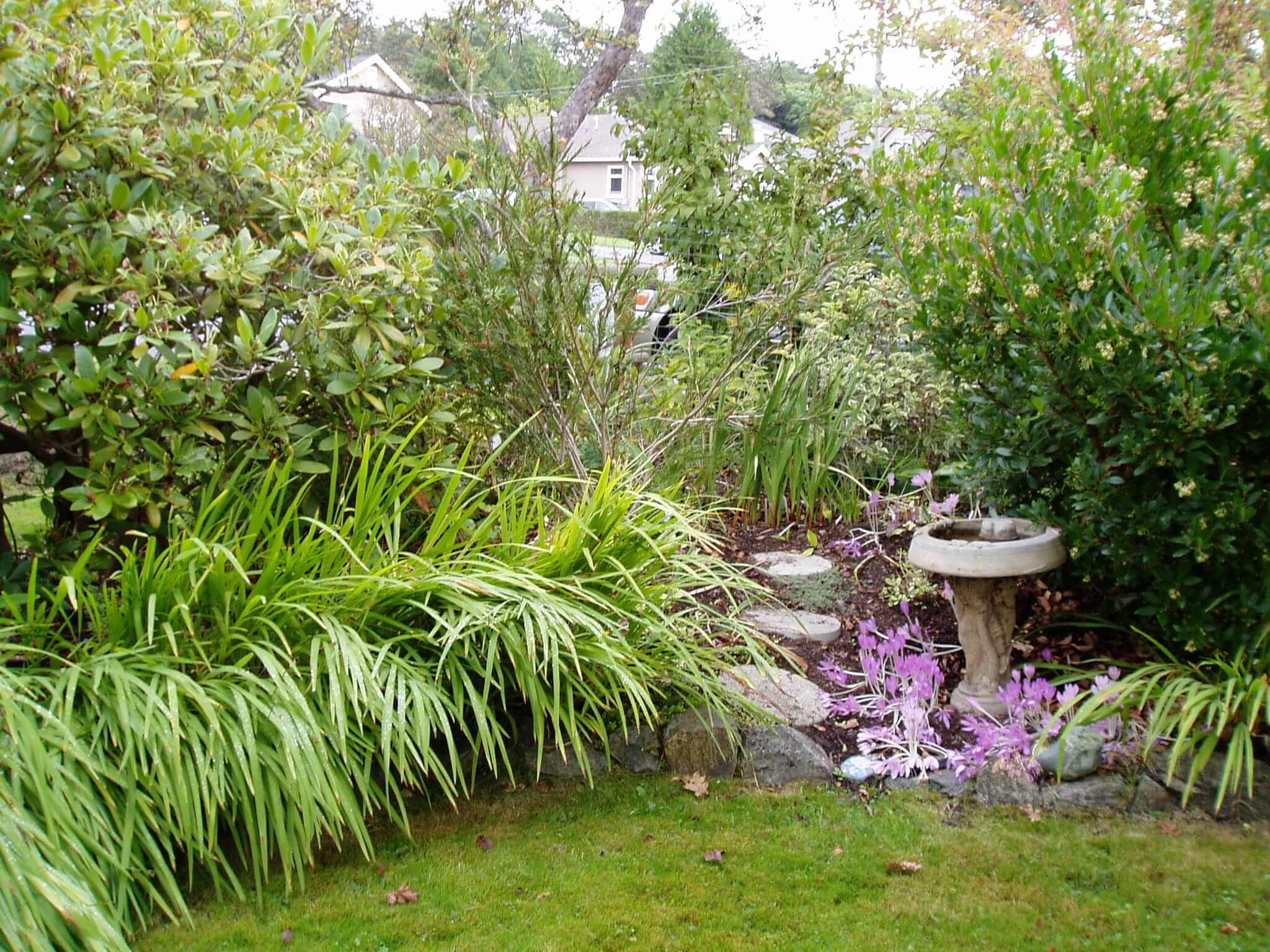 Five years in, it was starting to look like something more. The Rhodo (far left) loved the company – growing almost as much as the newer shrubs. Those shrubs were now large enough to stand up against the deer a little better, so I removed their cages. The birds & fairies were enjoying the extra privacy as the garden grew up around the birdbath. (photo: Sept. 2013)