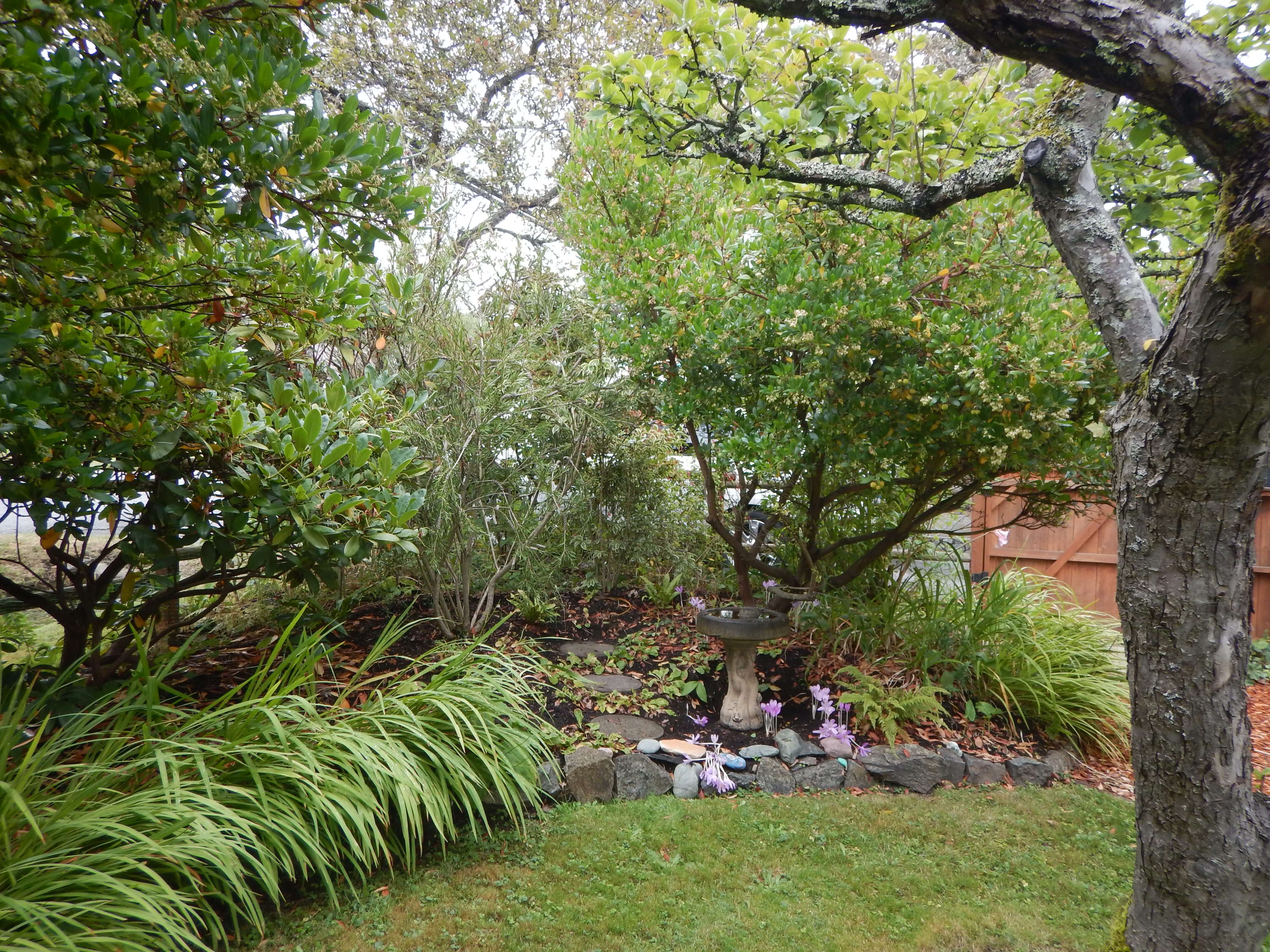After a dozen years, the party continues. The shrubs have matured into small trees. The border has grown into a mini-woodland. The birdbath almost disappears in the dappled understory! I reckon it’s even more magical than before. And each September, the fairies come to dance. (photo: Sept. 2019)