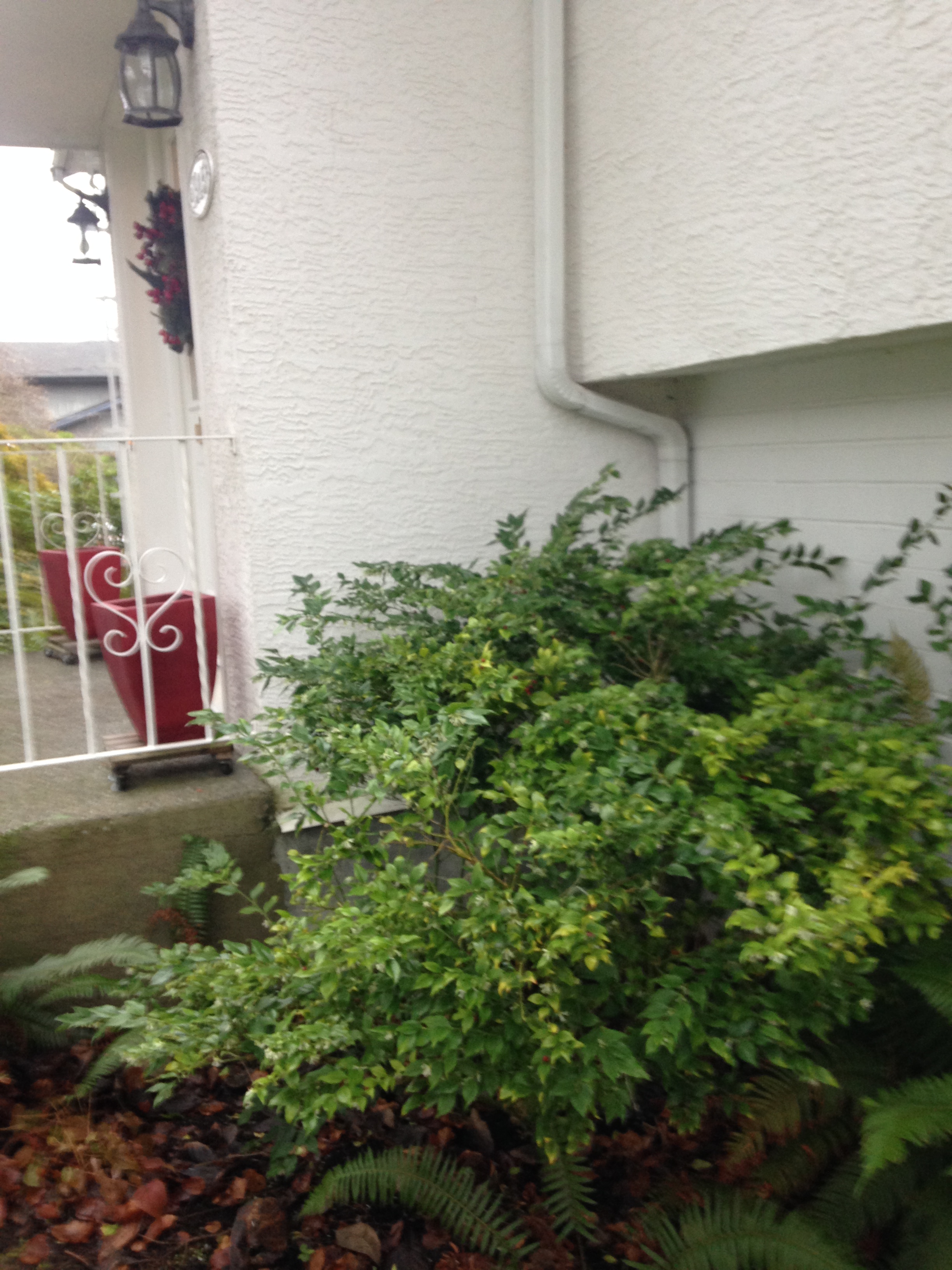 There aren’t any blooms to be seen. Most of DP’s garden has died to the ground for the winter. All, except an unassuming evergreen shrub & a couple of sword ferns.